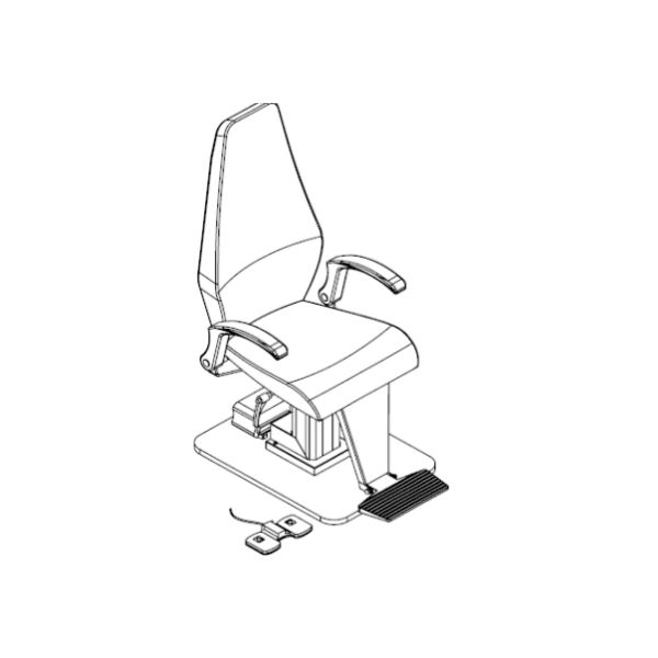 Fotel pacjenta z oparciem stałym – ergonomiczne krzesło okulistyczne z napędem elektrycznym.Schemat fotela pacjenta z oparciem stałym – widok techniczny z pedałem nożnym i podstawą regulowaną.