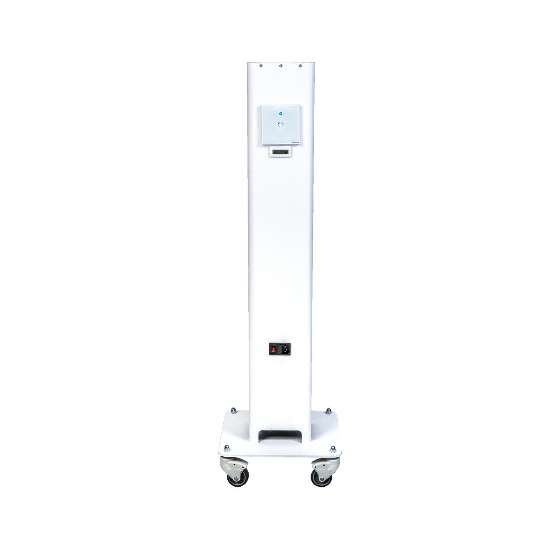 Lampa UV 110W UVgun TOWER 110 – mobilna kolumna do dezynfekcji powietrza i powierzchni promieniowaniem UV-C.Lampa UVgun TOWER 110 – tylna część urządzenia z panelem sterującym i przełącznikiem zasilania.Lampa UVgun TOWER 110 – górny wylot powietrza z kratką ochronną promiennika UV-C.