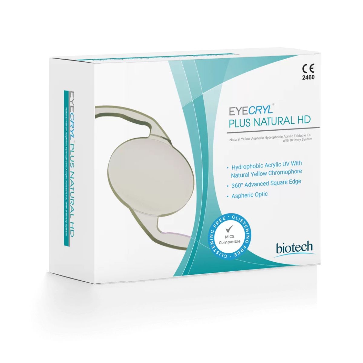 Soczewka Eyecryl Plus Natural HD – hydrofobowa, asferyczna soczewka wewnątrzgałkowa z filtrem UV i żółtym chromoforem.Opakowanie soczewki Eyecryl Plus Natural HD – soczewka wewnątrzgałkowa Biotech o właściwościach asferycznych i ochronie przed UV.